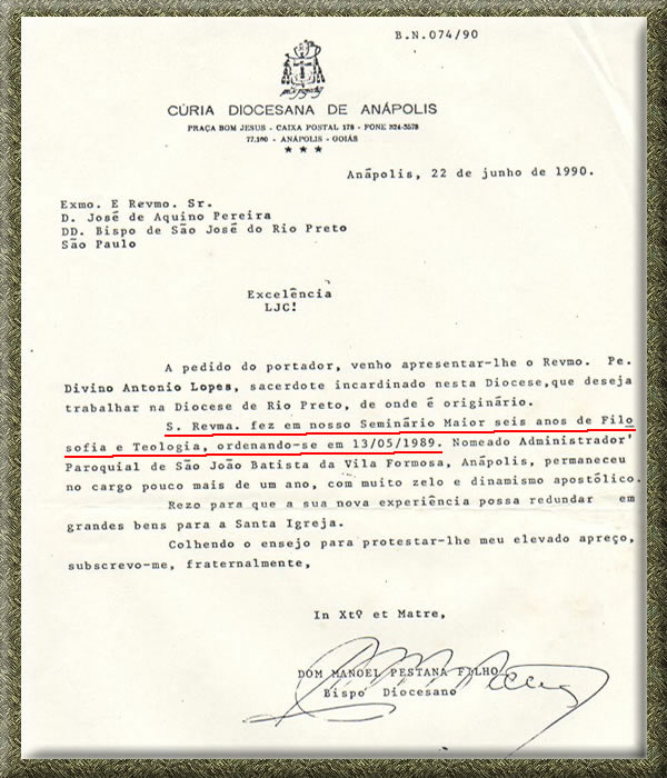 Nessa carta consta claramente que o Pe. Divino Antônio Lopes FP(C) foi formado por Dom Manoel em Anápolis - GO.
