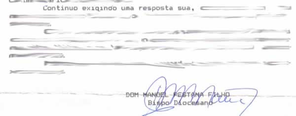 Dois trechos de cartas escritas por Dom Manoel ao Pe. Divino Antônio Lopes (Pe. Toninho) exigindo que o mesmo revelasse os nomes de dois padres que o acusaram de desvio de dinheiro.