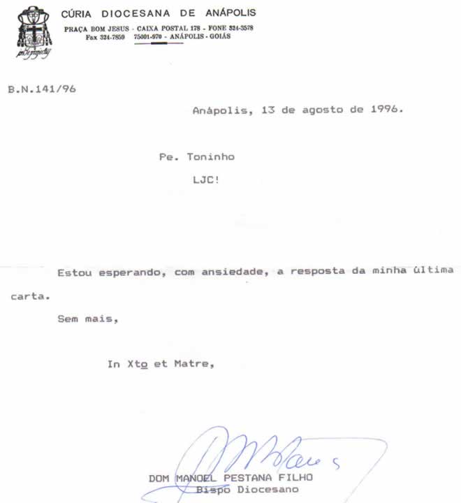Dois trechos de cartas escritas por Dom Manoel ao Pe. Divino Antônio Lopes (Pe. Toninho) exigindo que o mesmo revelasse os nomes de dois padres que o acusaram de desvio de dinheiro.